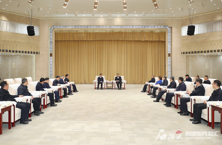 11月24日,自治区党委书记、兵团党委第一书记、第一政委马兴瑞,自治区党委副书记、自治区主席艾尔肯·吐尼亚孜在乌鲁木齐与青海省委书记、省人大常委会主任陈刚一行举行工作会谈。石榴云/新疆日报记者 邹懿摄