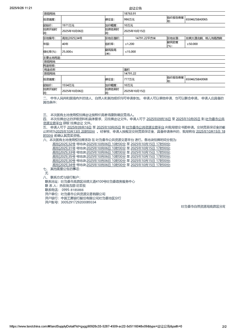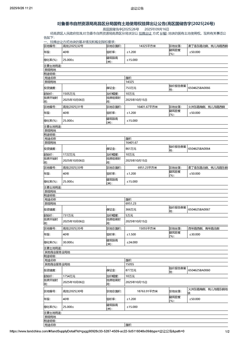 吐鲁番市自然资源局高昌区分局国有土地使用权挂牌出让公告(高区国储告字[2025]26号)
