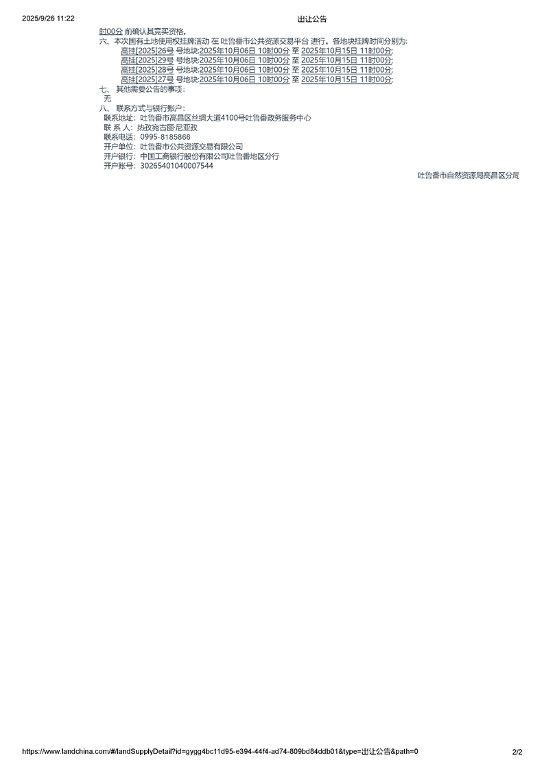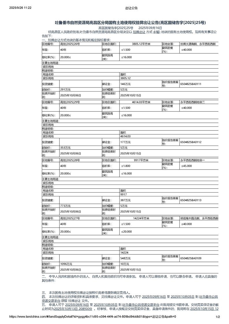 吐鲁番市自然资源局高昌区分局国有土地使用权挂牌出让公告(高区国储告字[2025]25号)